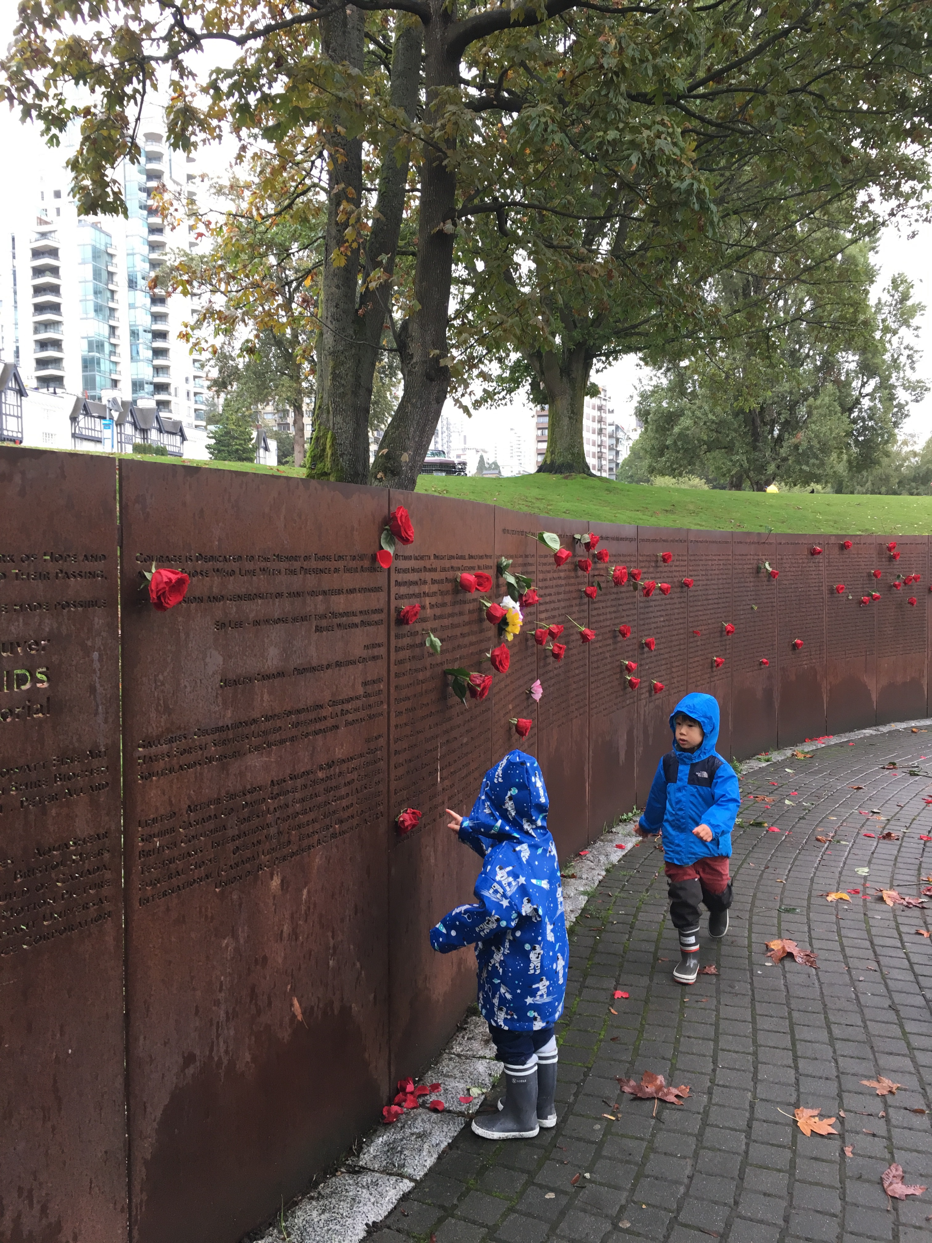 This is the AIDS memorial, with hundreds of names cut right through the steel, as well as quotes with living thoughts. There were some small children there with their mother, and she explained that these were people who had died and this was the way their friends chose to remember them, and aren’t the roses pretty? Then she mentioned ‘lunch’, and they dashed away.