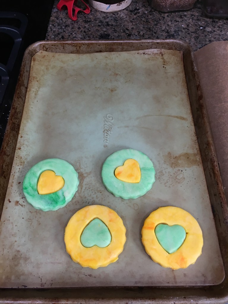 Instead of frosting the cookies, I made the cookies into the shapes. I used a new recipe with cornstarch, so the cookies keep their shape better and don’t turn into ‘globs’. This was important for the “shape inside a shape” cookie I had in mind.