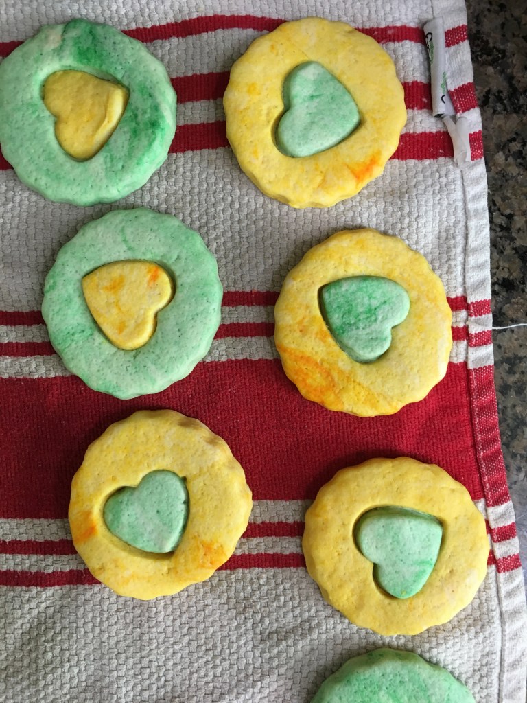 I mixed the dough, divided it, and colored each part. I wrapped and chilled the parts, then started rolling out and cutting.