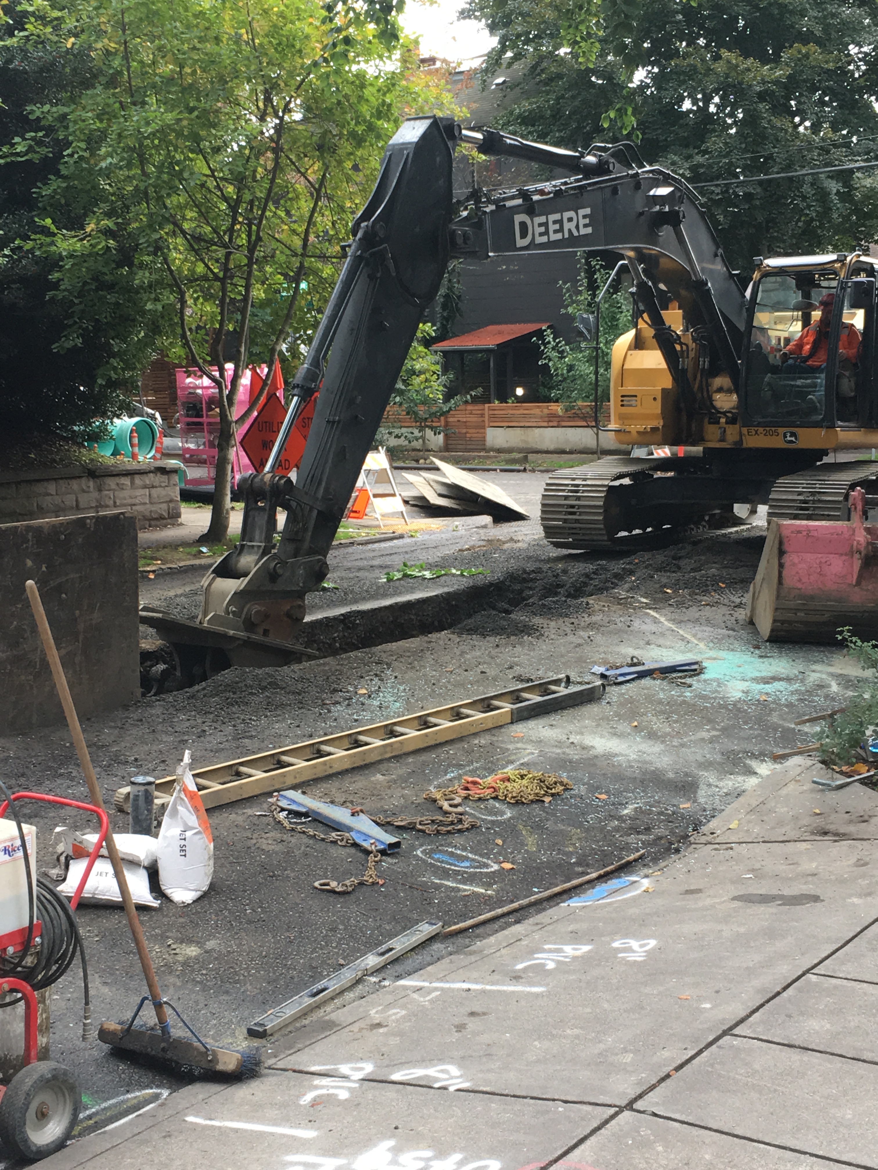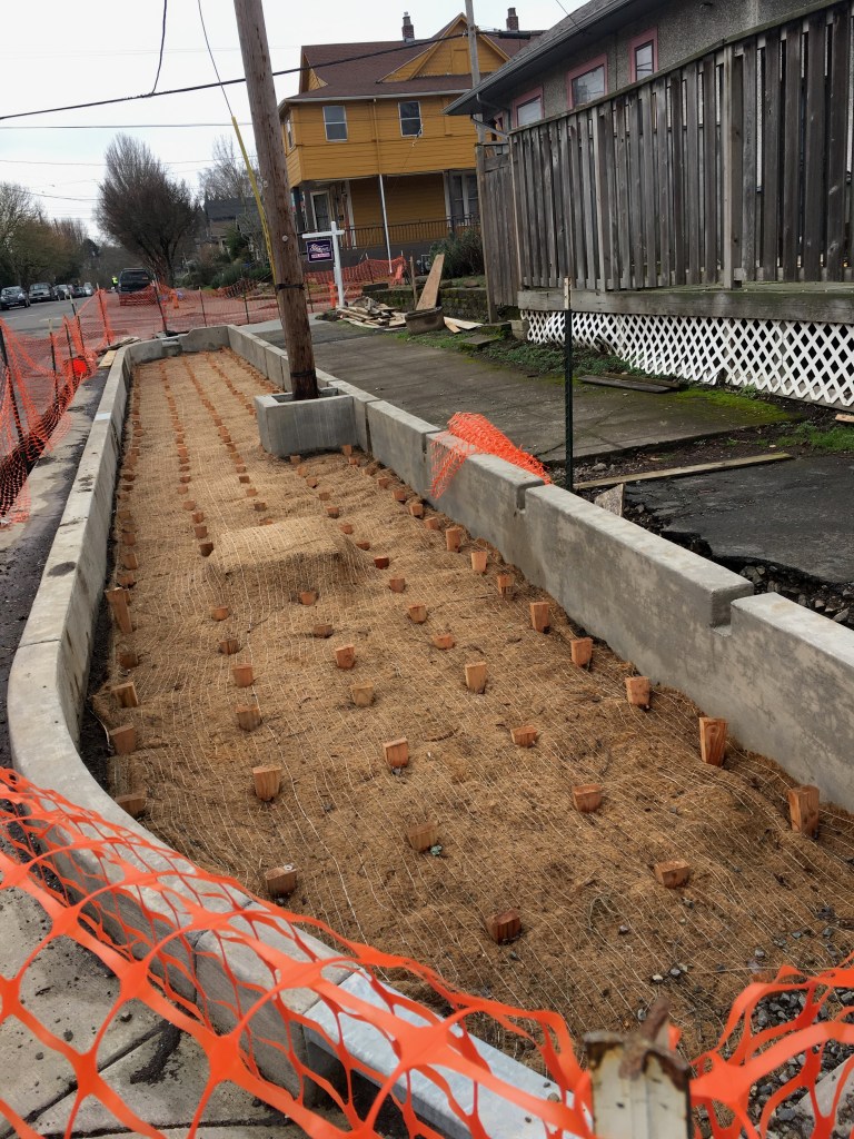 This week, our neighborhood in Portland is getting dug up for new drains and sewers, as well as new bioswales. Bioswales are the little street side gardens you saw here, that help clean the street water before it flows into the river.