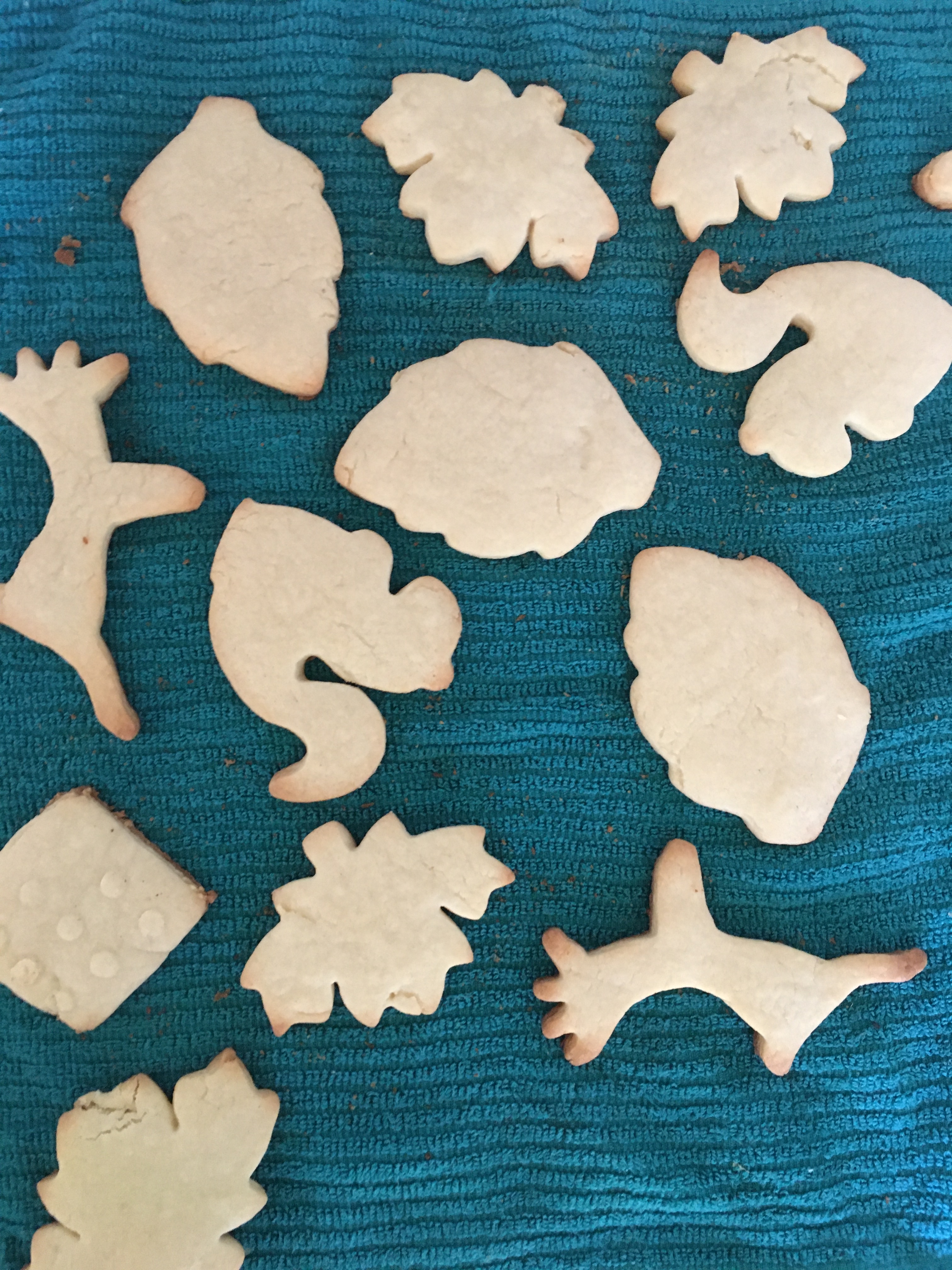 Kestrel chose four cutters (Jasper said he wasn’t particular) and we rolled the dough out on a split plastic bag to protect the table. We couldn’t find the rolling pin, so an empty wine bottle worked just fine.
