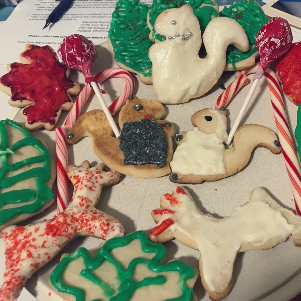 As we rolled and cut Kestrel started naming the cookies, and when they cooled enough to frost, she began creating their story.