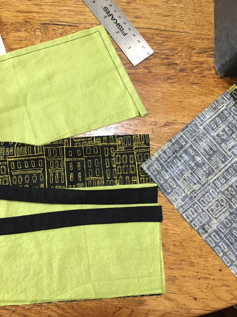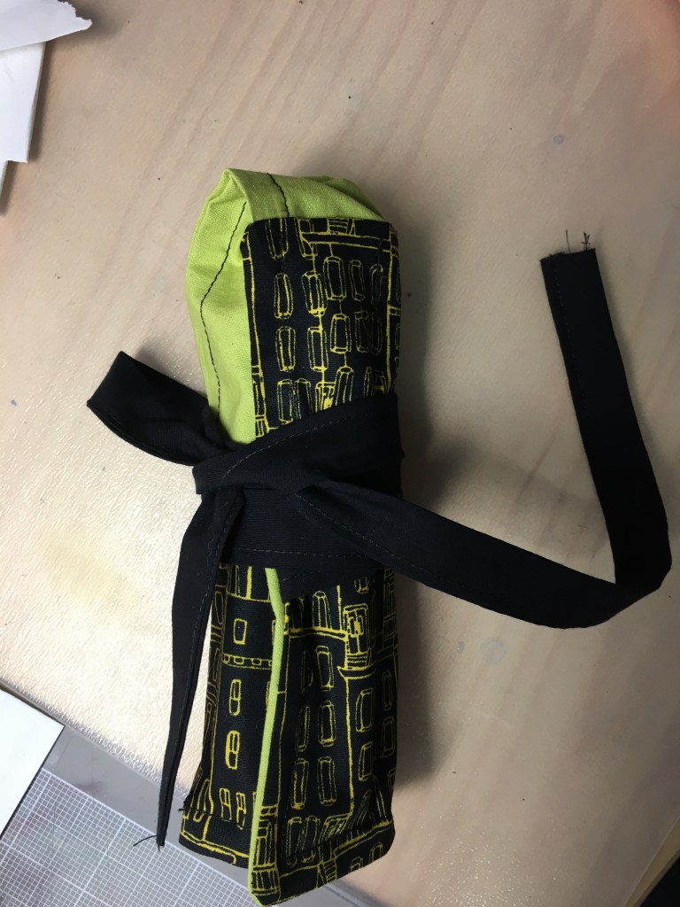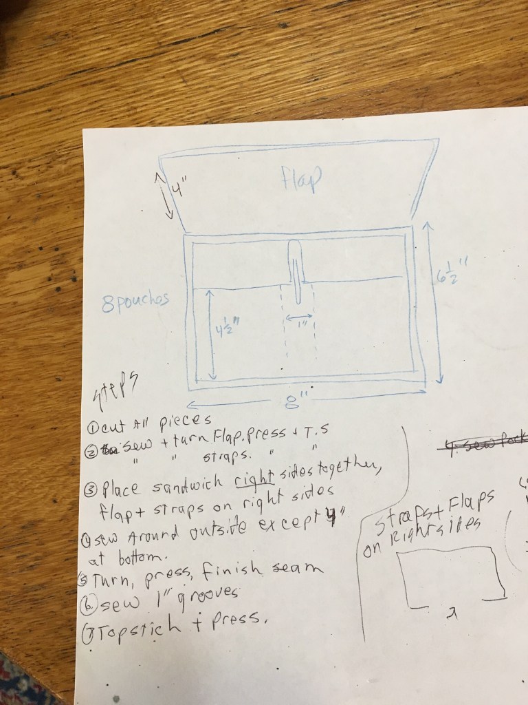 The crayon caddy, as it was, had one flaw. Pencils and pens tended to slip out of the top, like hot dogs slipping away from their buns. Auntie Bridgett hunted on line and found the Japanese Roll Pencil Case from B’etha Bags, which had a flap to fold over and contain the slippery pencils. Using their photos for reference, Auntie Bridgett drew me up a design and I made a pattern to sew from.