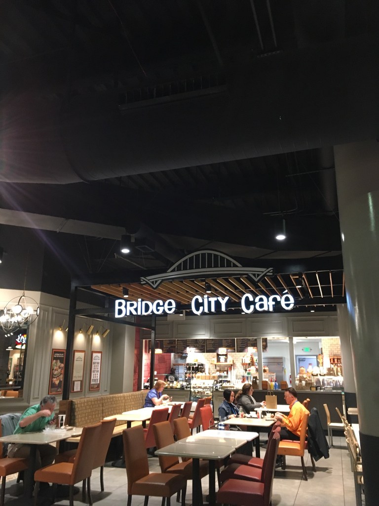 After we crossed the bridge, we stopped for lunch at the “food district” under Pioneer Plaza, and had some yummy sandwiches, fries, a milk shake, and even a yummy cookie from Bridge City Cafe. We were pooped, having walked nearly three miles, and wanted to get our strength up for….