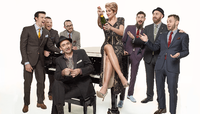 The group is made up of ten people, depending on the venue, but always features Evan Palazzo on piano, Elizabeth Bougerol as their fabulous vocalist, and A. C. Lincoln, a tap dancing percussionist. Trombones, saxophones, a stand-up bass, another drummer and even a ukulele make the magic happen. They focus on jazz from the first part of the twentieth century, about 1900 to 1950. Their repertoire includes Fats Waller’s “Your Feets Too Big”, Sophie Tucker’s “Some of These Days”, and Al Dublin’s “Lulu’s Back in Town”.