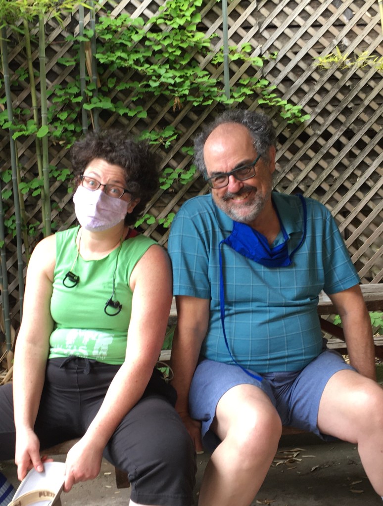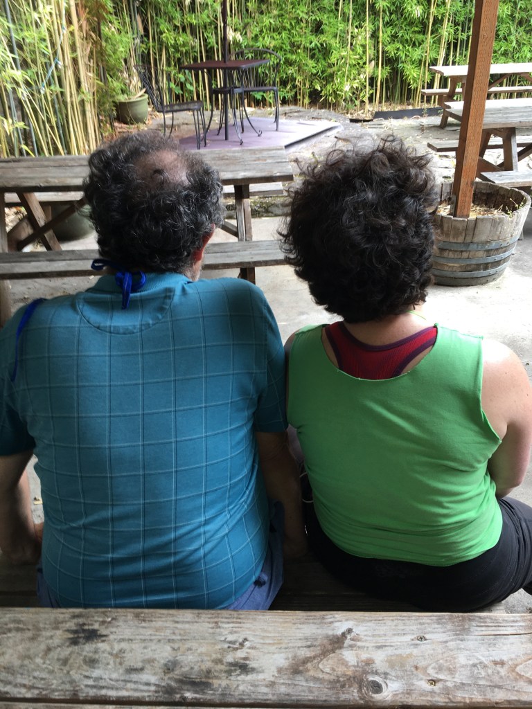 At the park we saw folks visiting (from safe distances), walking their dogs, and working in the community garden. Auntie Katie ran over (literally, she was on a run) and I realized I was hungry, so we walked to an old favorite, the Rocking Frog. Their back patio is perfect for non-crowded visiting. We took some Quarantine hair portraits! Katie gets her curly hair from Grandpa Nelson, so they kind of look alike, like Mad Scientists.