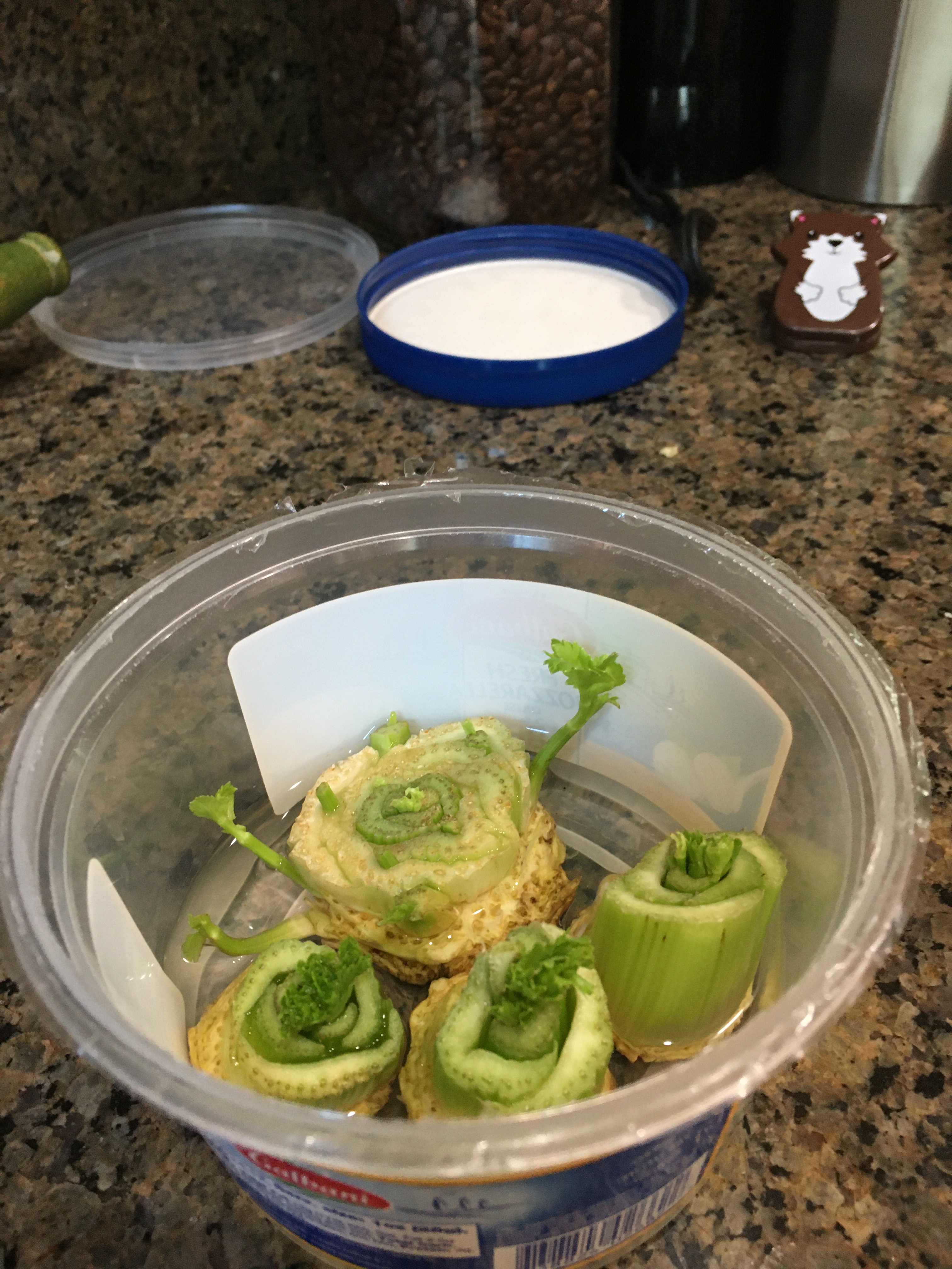 Auntie Bridgett read that the bottom of a celery stalk would keep growing, even when you had eaten the rest. This was almost too weird to believe, but the window sill was free, so we gave it a shot.