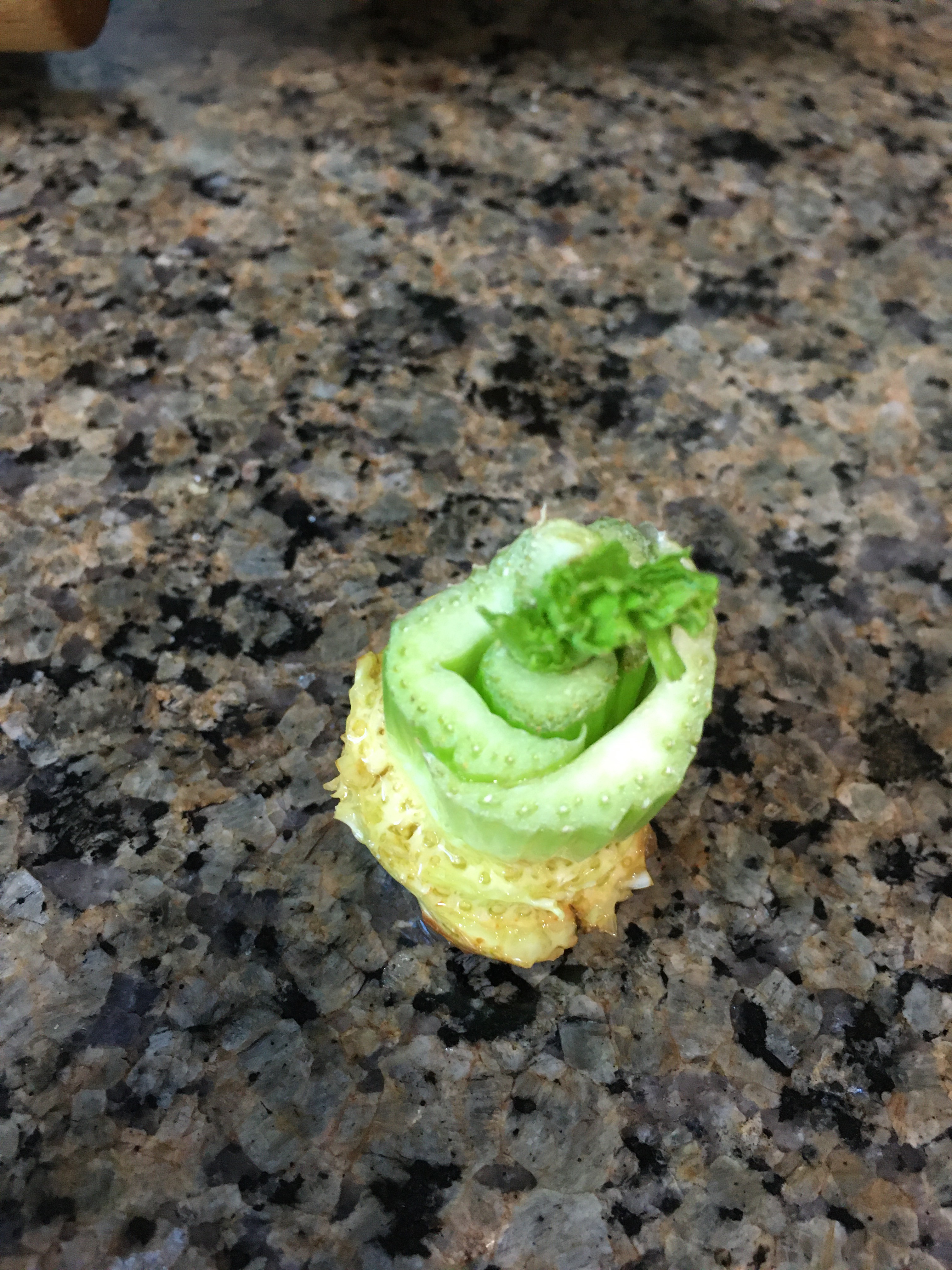 We put a half inch of water in a plastic dish and set the root ends of the stalks in. Then, as with all experiments (and gardens), we waited. It didn’t take long,