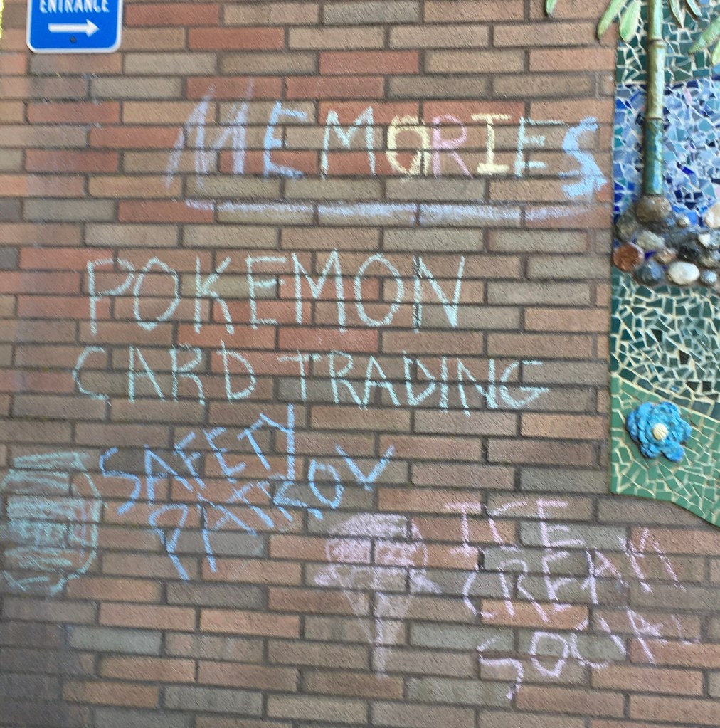On the way, I passed this large brick school. I noticed the sentimental chalk graffiti first, then the wonderful bas-relief mosaic murals.