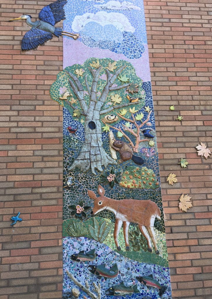 The four murals are each about five feet wide and twenty feet high and show nature as it changes during the seasons. I took pictures to remind me, and looked them up when I got home. They were created by Lynn Takata in 2008 when she was the artist in residence at the school. Ms Takata is a local artist and art teacher at several POrtland colleges.