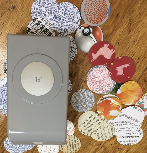 On my own, I’ve been working in the Journal. As a matter of fact, I am on my last page! For my last piece in the book, I have returned to a favorite shape. Yesterday, I borrowed Auntie Bridgett’s ek 1 1/4 inch hole cutter and started chopping circles out of papers in my recycling box.
