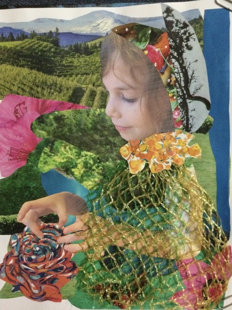 One of my favorite pictures was one made with a printed photo of Cousin Kestrel, a fruit bag, and bits of magazines. It shows her as a flower fairy, which is just about right.