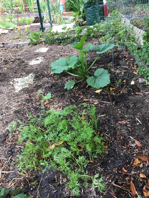 The zucchini plants are still getting bigger. I wonder when they will start to take over the plot! The tomato plants I put in, from the nursery and from my windowsill, are still alive and getting taller. The carrots are getting taller, as you can see in the picture. But it has been weeks and weeks since I planted them, and I felt the need to know what was going on under the ground. I pulled a medium sized one up!