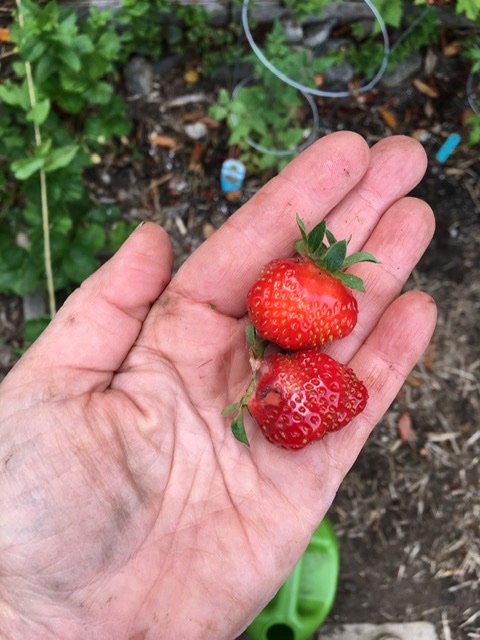 The strawberries planted by a previous gardener are coming ripe, but up until now, the squirrels have gotten to them before I did. Not today! Hooray! They were wonderful.