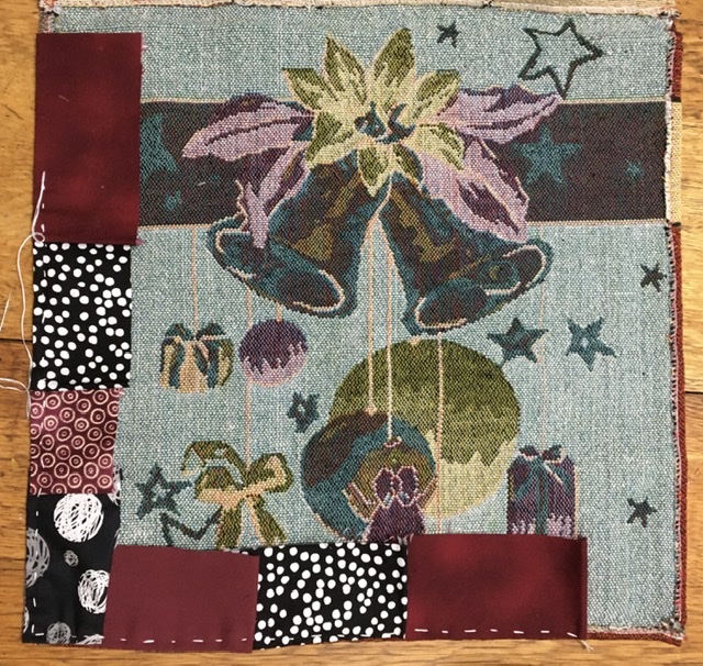 I took time off from Kawandi to do another project (which I will tell you about when the time is right) and then wanted to do another one. Auntie Bridgett found this old piece of Christmas decoration that she wasn’t happy with, and offered it as a backing for my next piece. Thanks, Bridgett!