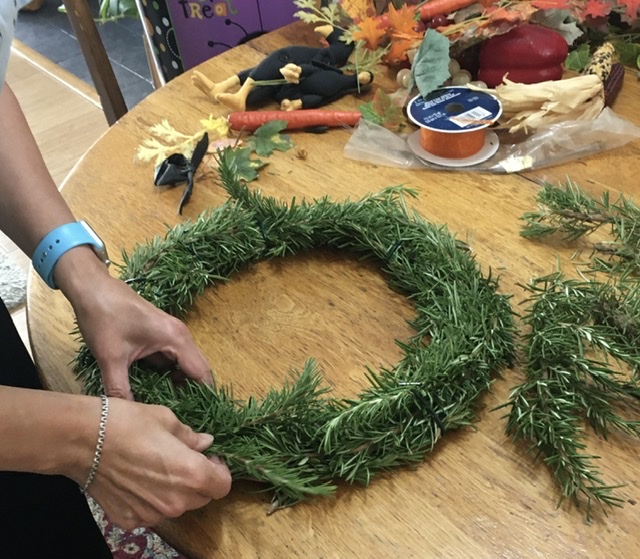 Back home, we found an empty frame from a past year’s wreath and filled it up. The rosemary branches bent easily around the circle.