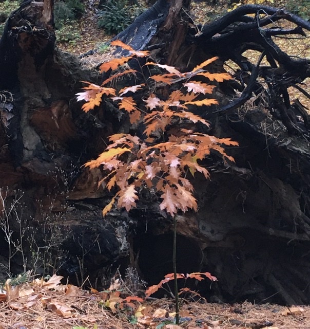 This past Spring, several of our old giants fell in a big windstorm. This is a natural way for a tree to die, but it is still sad to see. This oak fell over with some of its roots still in the ground. The City cut most of the tree away to keep the paths safe and the dog park clear.