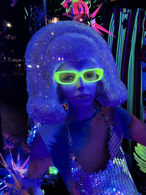 A glowing origami style bunny was in one window and a weird, day-glow scene with bouffant hairdos and tiny aliens was in another.
