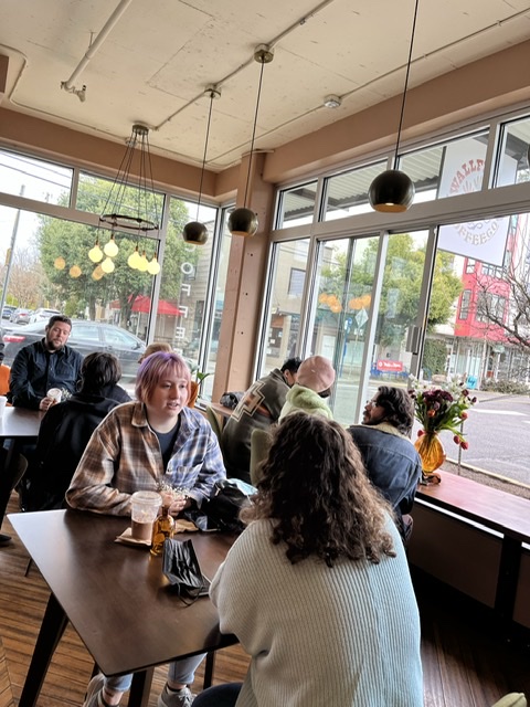 Grandpa Nelson especially hates crowds and found a small table in the foyer of the building next door where we could enjoy our coffees and chai out of the crowd, but still hear the music. As is usual for new places in Portland, the coffee was more lightly roasted than we like, but it was well-brewed. Lighter roasted beans give a more caffeinated coffee but also taste a bit sour.