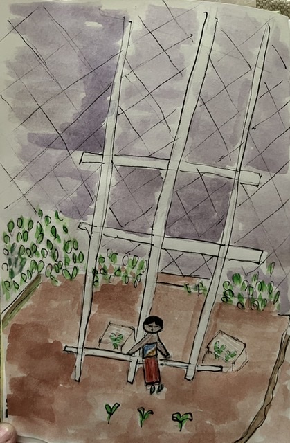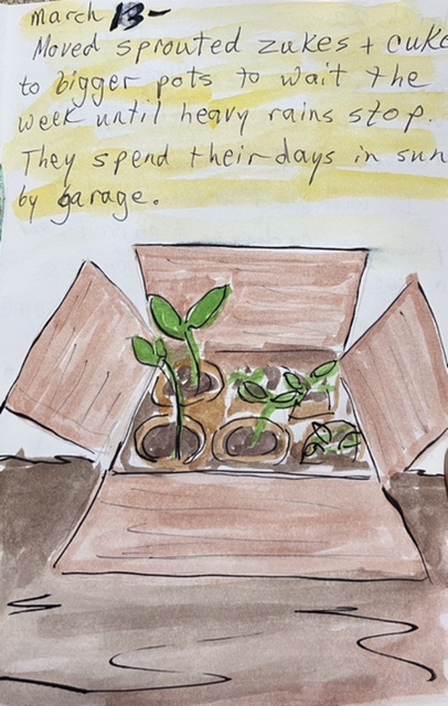 I am working in my journal already this year, recording the locations of my terraces and tomato cages, noting what I planted and when. Since I don’t like painting or drawing while perched on a stool or sitting on the wet ground, I do my journal pictures from photos I take.