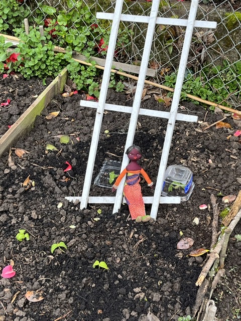 Hello! Girl, you wake up early! I posted that blog at midnight and you read it already! I found the doll that I call Mlesi on a side walk last year and adopted her. Her style of hair and dress appear west African, but I can’t be sure. Mlesi is a word from one of the west African languages ( I knew it last year but have forgotten) that means guardian. She sits in the garden, more interesting than a gnome and classier than a flamingo, and watches over my seedlings.