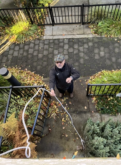 A long rope, a bosun’s knot, and a couple of good pulls, and up she came, from the front patio up over the balcony railing and into the front room.