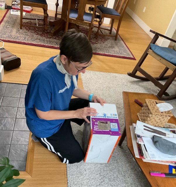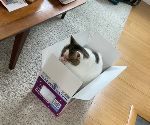 We all know that cats love boxes, so this past week when the first box of matzoh got emptied, we set it down for Mouse to sit in.