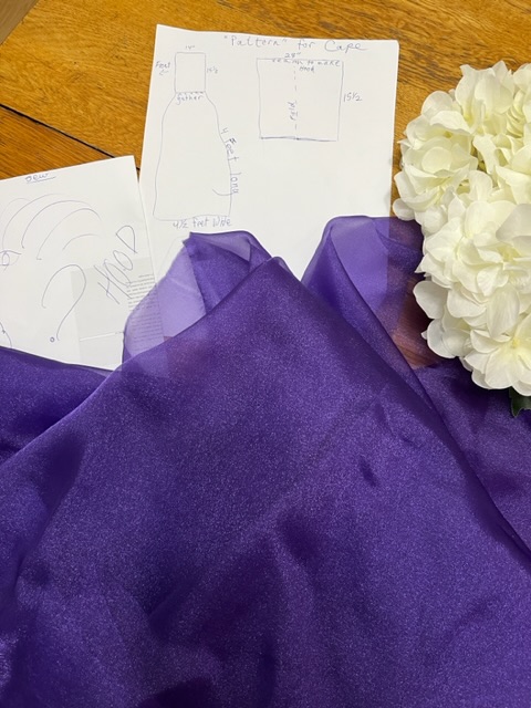 With grand daughters around, there are always going to be projects! Our latest one is a delightful cape for Kestrel. She and Auntie Katie picked up the fabric and trims a few weeks ago. We used a cape we already had as the pattern.