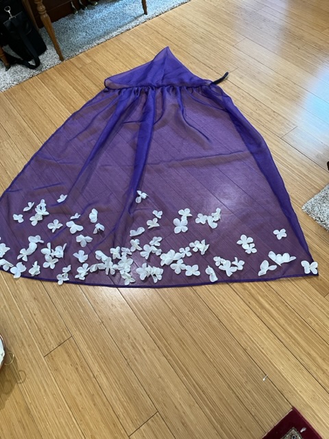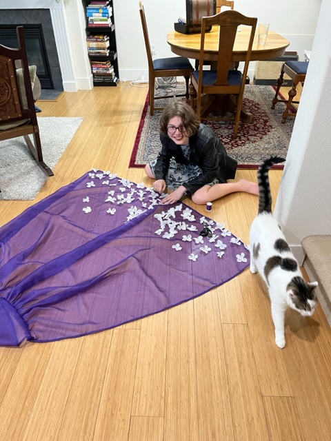 We pulled a dozen silk flowers apart, laid the cape in the floor, and got down to work! It was crouchy, fiddley work, but we got about fifty petals sewn on. Mouse helped, of course….
