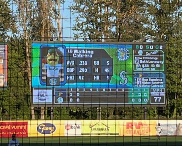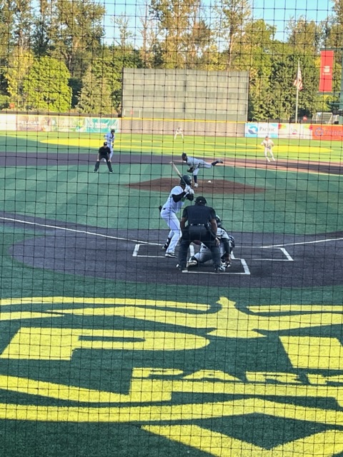 We had good seats behind home plate, and watched the Emeralds face off against the Everett, Washington Aquasox. Yes, it seems an odd name for a team, and some of the players follow suit. There is Harrison Ford, who goes by Harry; then there is Walking Cabrera. Yes, Walking. I assumed they were teasing a fellow named Joachim by misspelling it, but nope. That’s his name.