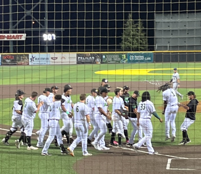 The actual game was fun, too. The Emeralds were behind, then tied it up. And in the last few minutes of the tenth inning, BAM! A walk off home run sent everyone out cheering. There were group hugs and cheers and bottles of water dumped on players.
