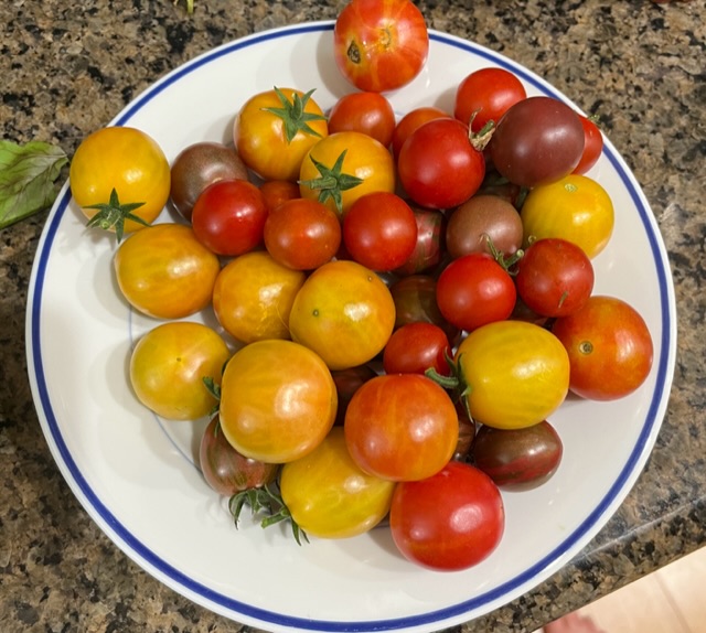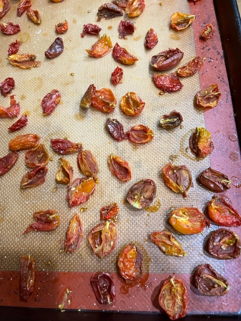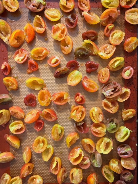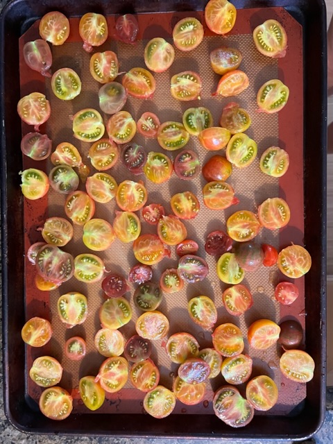 Today I picked another pound and looked up how to dry them in the oven, since our damp northwest weather makes “sun dried” impossible. To start, I rinsed off the tomatoes and cut them in half.