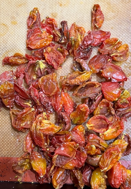 And, sure enough, after four and a half hours, the pound of cherry tomatoes had turned into a cup of these odd little raisin-y things. I ate a few, and they were delicious! Sweet and chewy and very intense.
