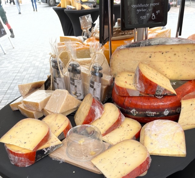 You know I love cheese! Sharp, stinky Parmesan and runny baked Brie and cool mozzarella… they’re all good. I even take pictures of it when we travel. Here is some Peppery Gouda smiling for the camera in Utrecht.