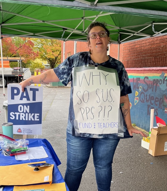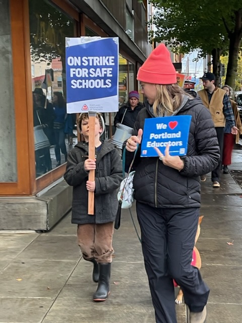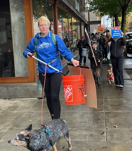 This picket line was familiar, but also uniquely Portland. Some teachers carried litter grabbers and buckets, making the route more tidy as they went.