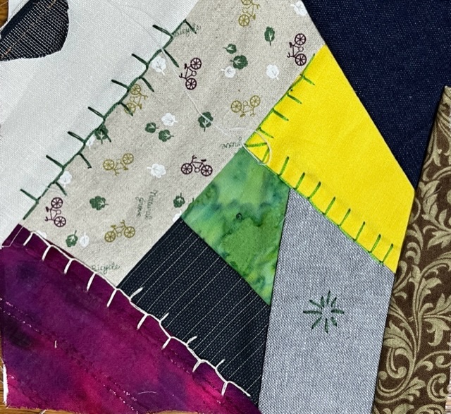 Once I get a good stack of blocks done, I start embroidering. This is fun, because I just start stitching along the edges of the piecing.