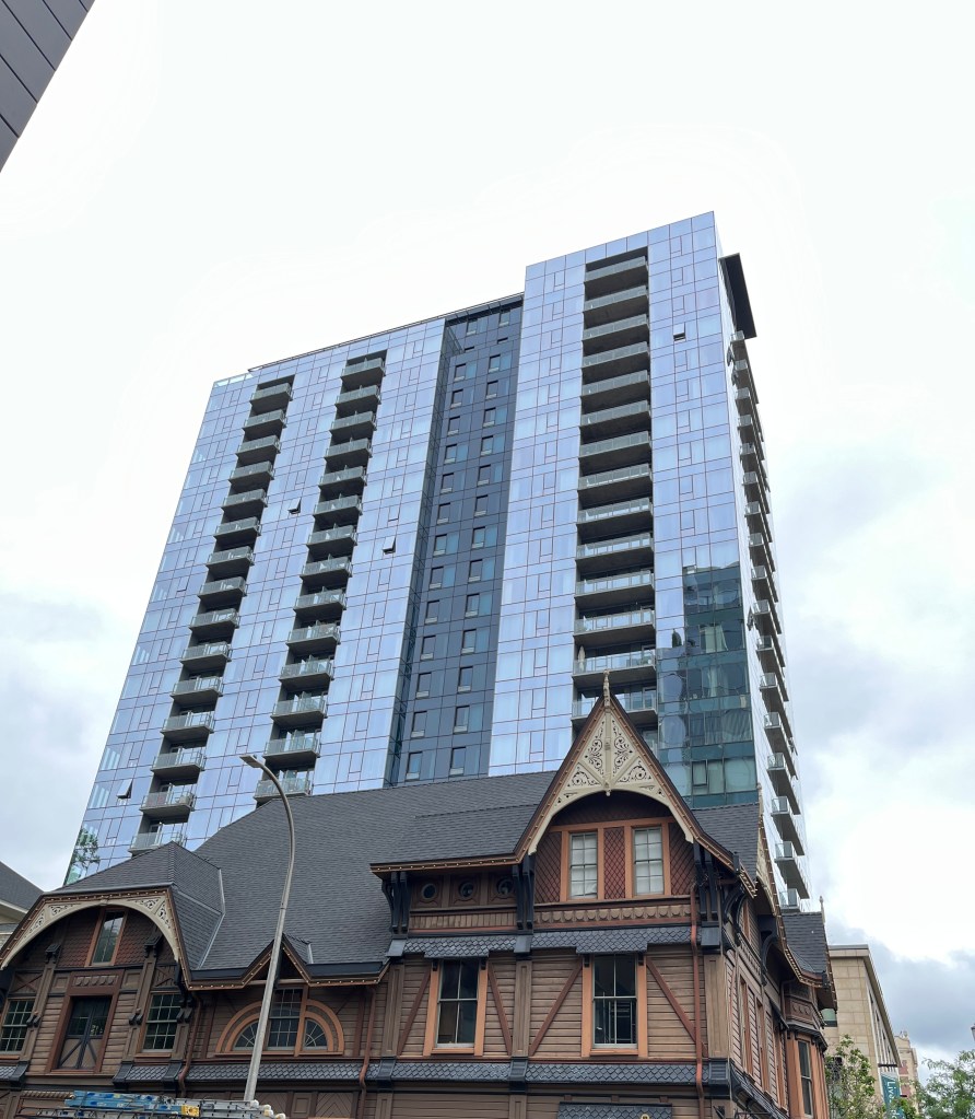Still further along, we found this, one of my favorite views in downtown Portland. Here you see a twenty story apartment building, built in the last five years or so, standing just behind the carriage house of Elliot Ladd’s old estate, built in 1883. Even though the newer building is a more efficient use of the property, I think I like the older one better. It’s kept in good condition because it was used for a fancy restaurant for years, and just recently closed.