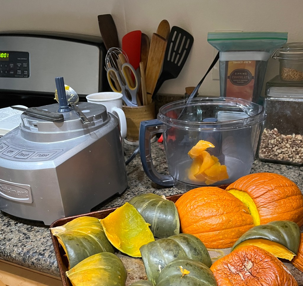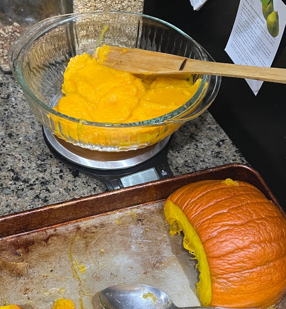 So today I processed (roasted, then puréed) our two pumpkins and Stacy’s two, and made about five pounds of pumpkin puree. Some will wait in the freezer for a few weeks, I think.