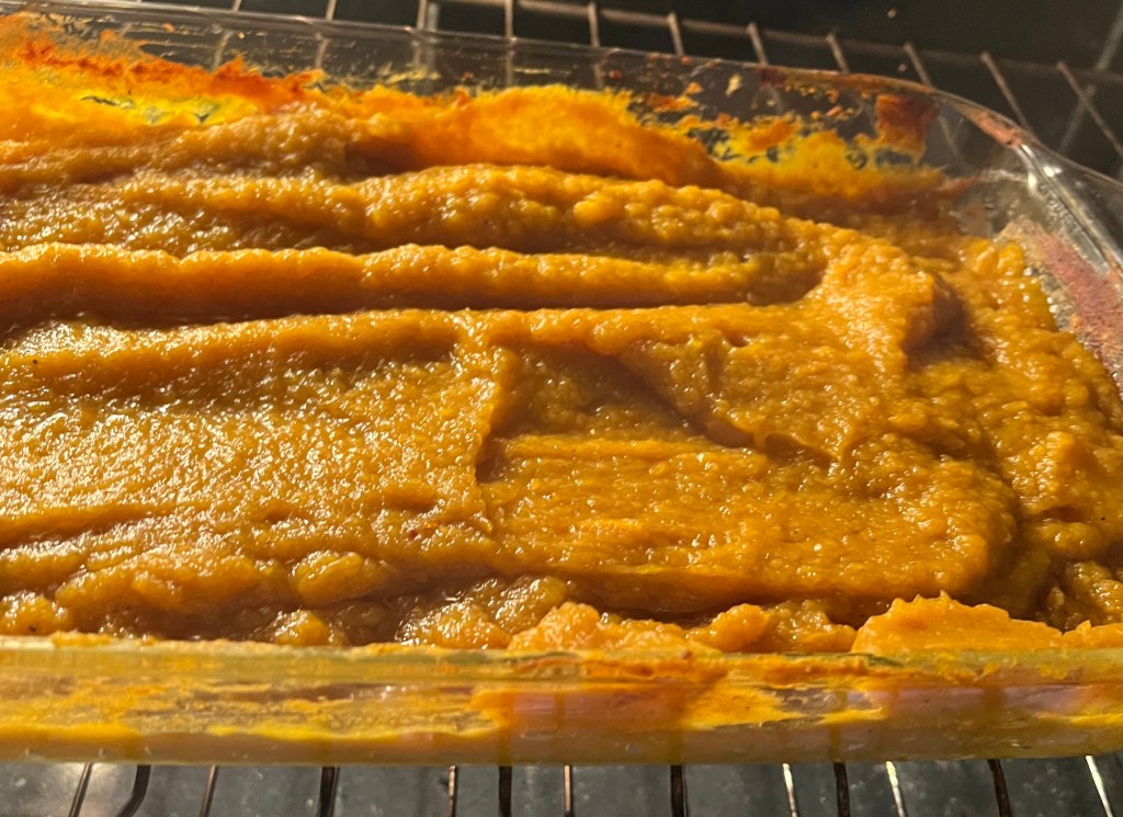 The pumpkin puree is flavored with a little bit of honey, real butter, and fall-ish spices, and roasted for an hour and a half at 350 F. This evaporates a bunch of moisture and concentrates the sweetness. It is so easy, and makes good use of the giant fruit that a lot of people just throw away after Halloween.