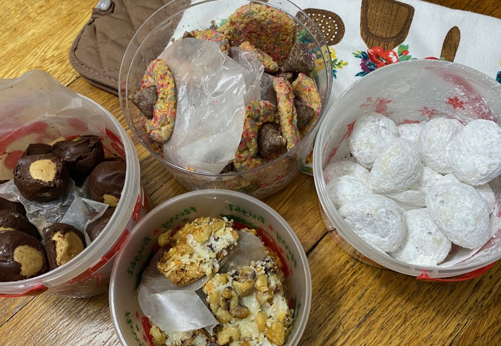 Bridgett’ s Aunt Linda sent us goodies! Kiss cookies, coconut blondies, wedding cookies, and, most heavenly of all, peanut buckeyes! For a long time, I just hovered over the containers and sniffed, almost drunk with the wonder of it. Then I chose one buckeye and ate it in tiny, grateful nibbles.