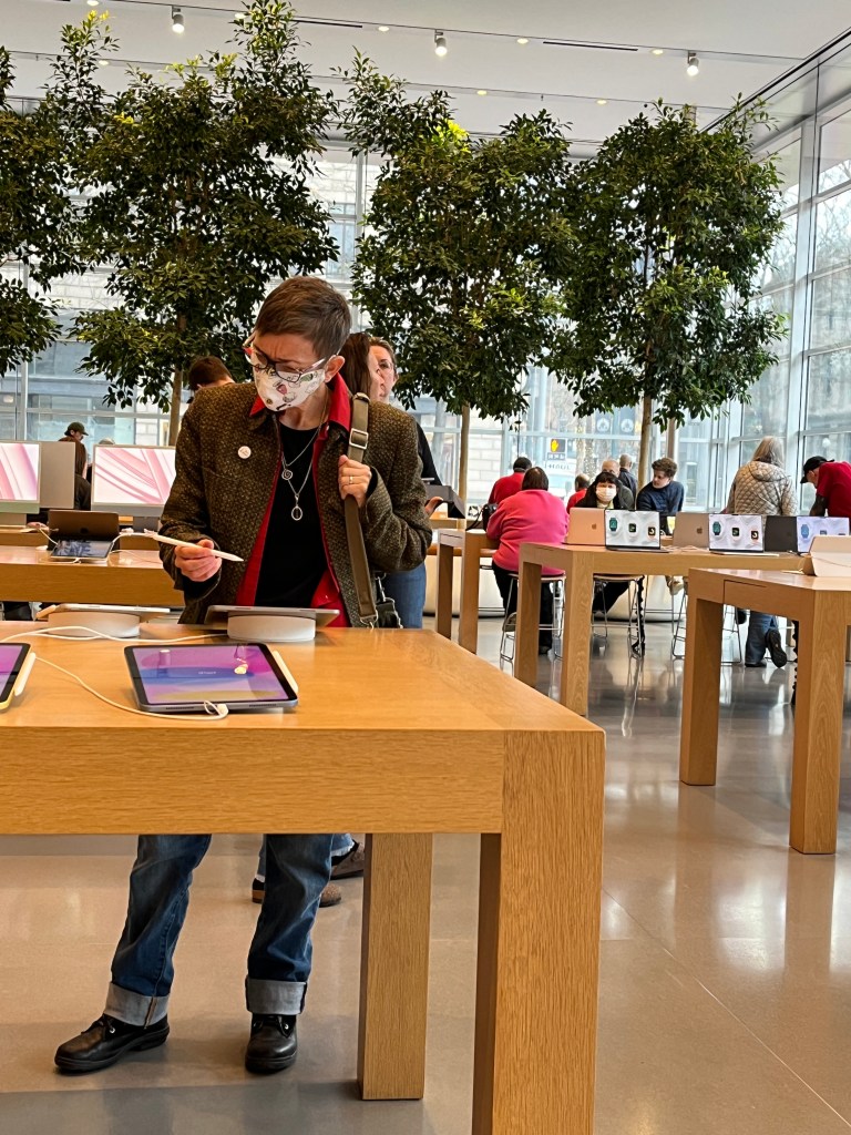 Grandpa Nelson is still down with Covid, and is staying inside. But Auntie Bridgett and I had some business to do, so we masked up, caught the number 15, and headed downtown. We stopped at the Apple Store to exchange a wrong-sized iPad cover, and Bridgett did some looking at some new goodies.