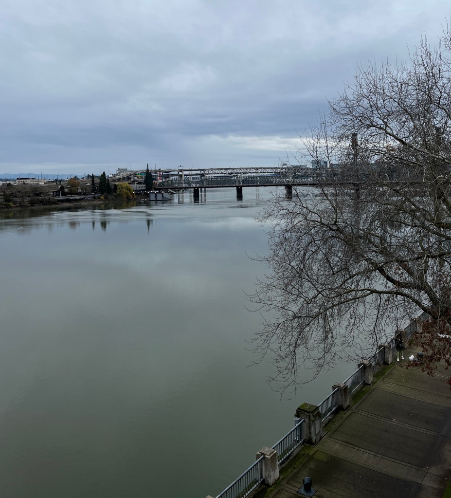 Full of lunch, we walked down to the river and across the Morrison Bridge. I love the long views we get from the bridges, even when the sky and the river are nearly the same shade of grey.