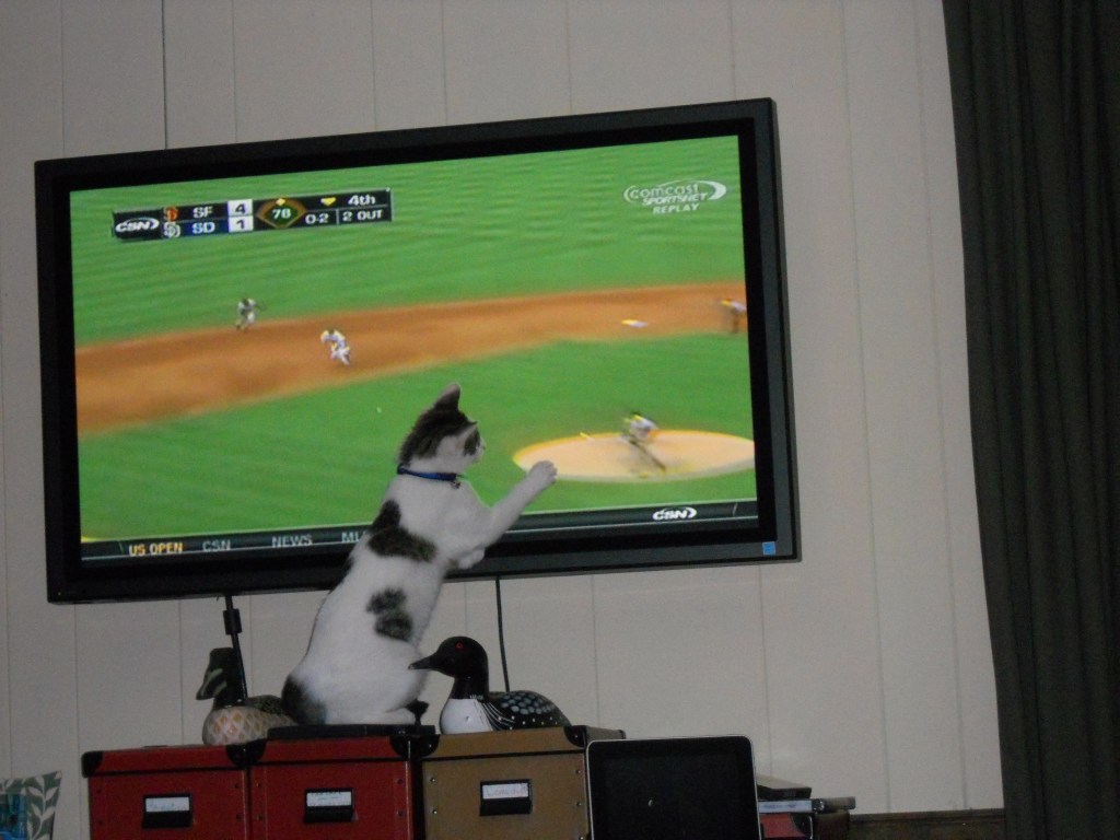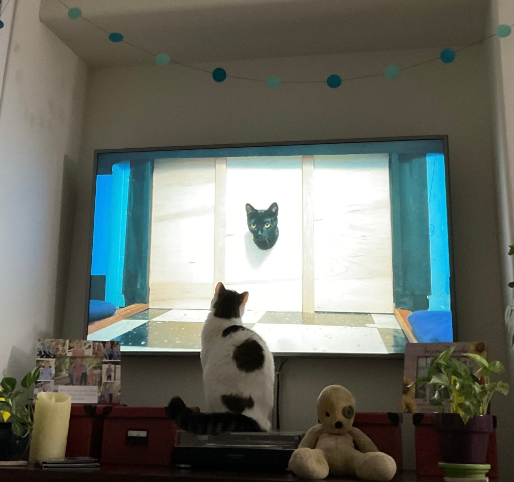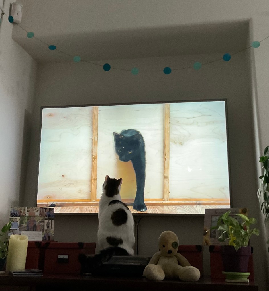 And last night, she enjoyed another show. The documentary “Inside the Mind of a Cat” included footage that was just too good to ignore. She got up off my lap and went to investigate, coming almost nose to nose with the cats on the screen.
