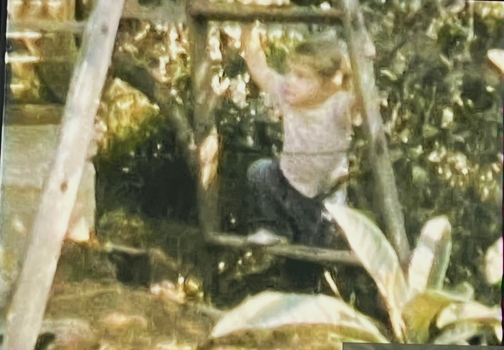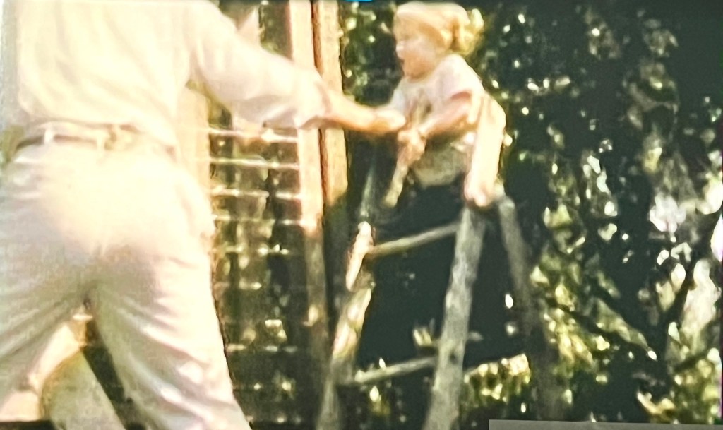 He is working on what will become my brothers’ room and I have somehow climbed to the top of the ladder. He sees me (probably given the heads up by my Mom, who must have been running the camera).