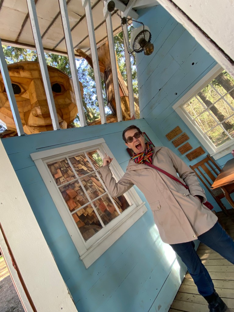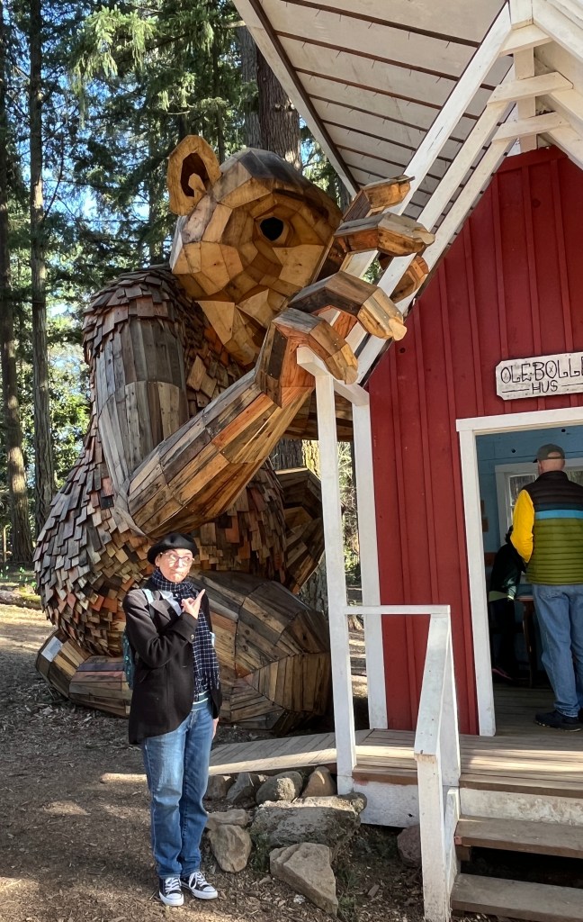 Having walked up and down the main drag of the Village, it was time for our next adventure. I realized that we were just minutes from The Nordic House, and that Auntie Bridgett hadn’t seen the Troll yet. Once we found parking (lots of people like this place!) we walked up the Troll Path and paid a visit to Ole Bolle.