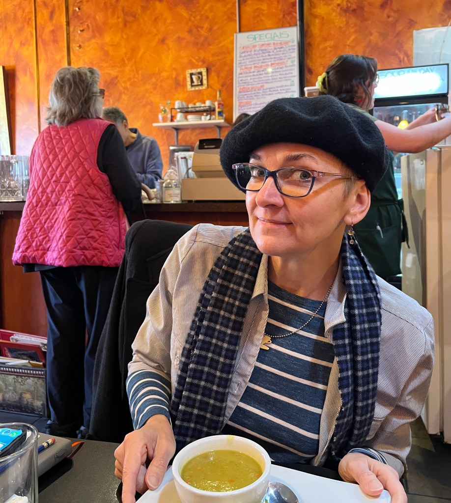 As we walked down the street, we realized that despite the bright sunlight, it was very chilly. We stepped into Annie Bloom’s books to warm up, and I found a new collection of short stories called “Marple”. Think of it as fan fiction, if you will. Stories starring Miss Jane Marple, Agatha Christie’s geriatric British sleuth, but written by contemporary female authors. I have already finished one and am enjoying it immensely.