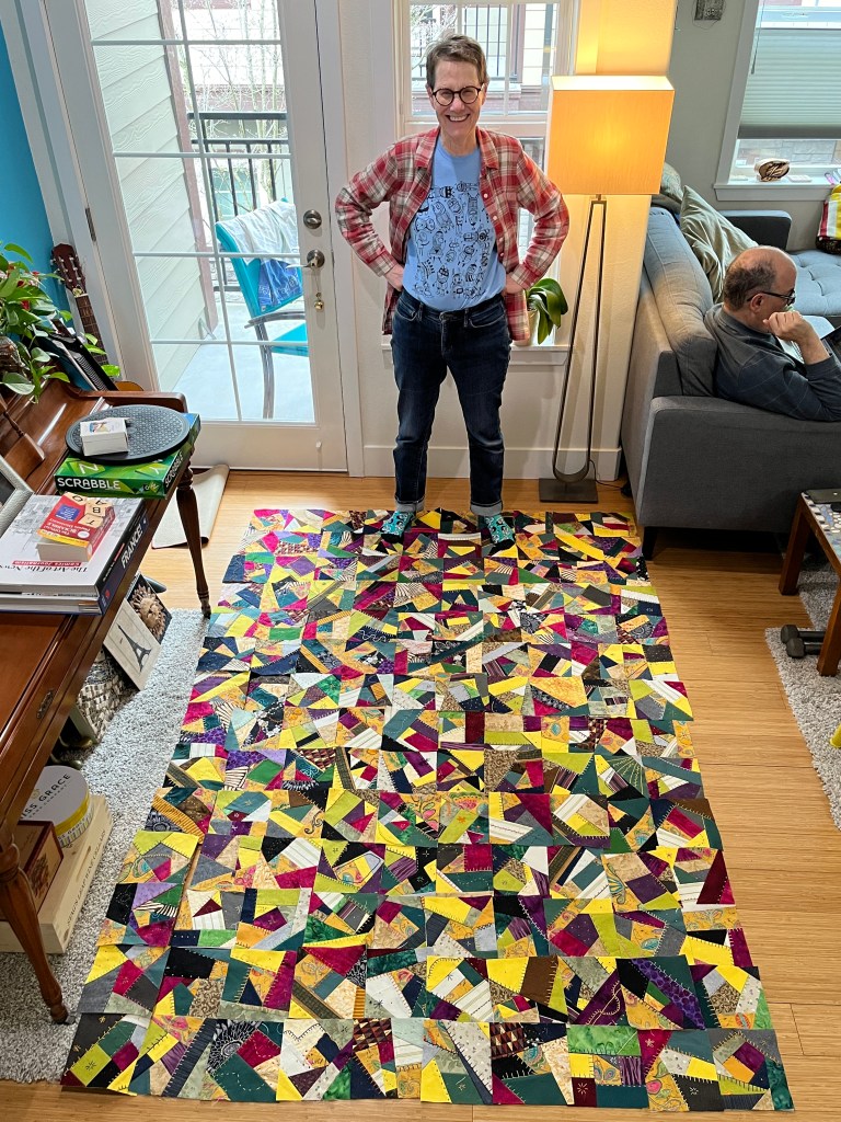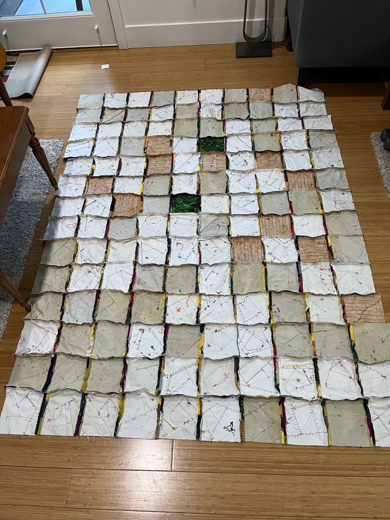 I moved some furniture so I had room to spread all 140 blocks out and make sure they looked good…. A nice balance of darks and lights over the whole area of the quilt. I look like Gulliver standing over the landscape!