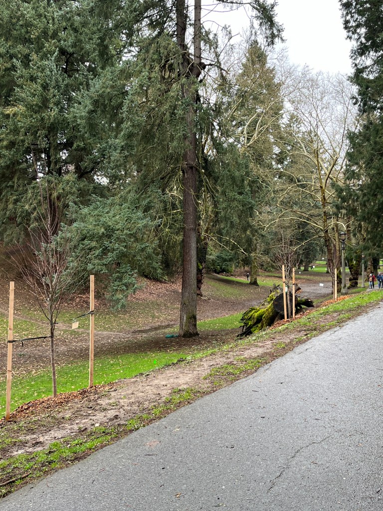 The city of Portland has planted over a dozen new trees in Laurelhurst Park, just a few blocks from us. These are to replace trees that have fallen in the last few years, victims of storms, heavy winds, and in some cases, just old age.