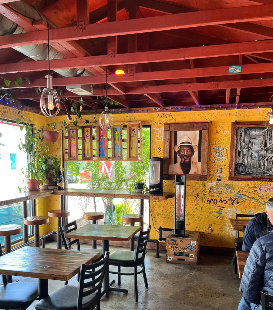 This place is colorful, friendly, and very funky. The walls are a bright yellow and have been drawn and written on by hundreds of folks. Tiny cartoons and bits of poetry elbow each other for room all over the place.