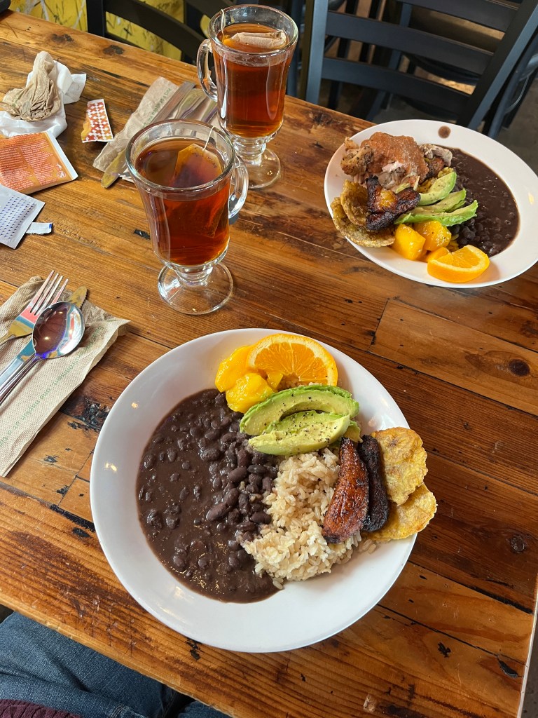 And, of course, it is delicious. On such a rainy, chilly day, it was delightful to slurp up some black beans and rice with fried plantains with mango and avocado on the side. There are spicy options, but I opted for non-spicy this time. There was chicken and pork, but I went vegan. And it was all wonderful.